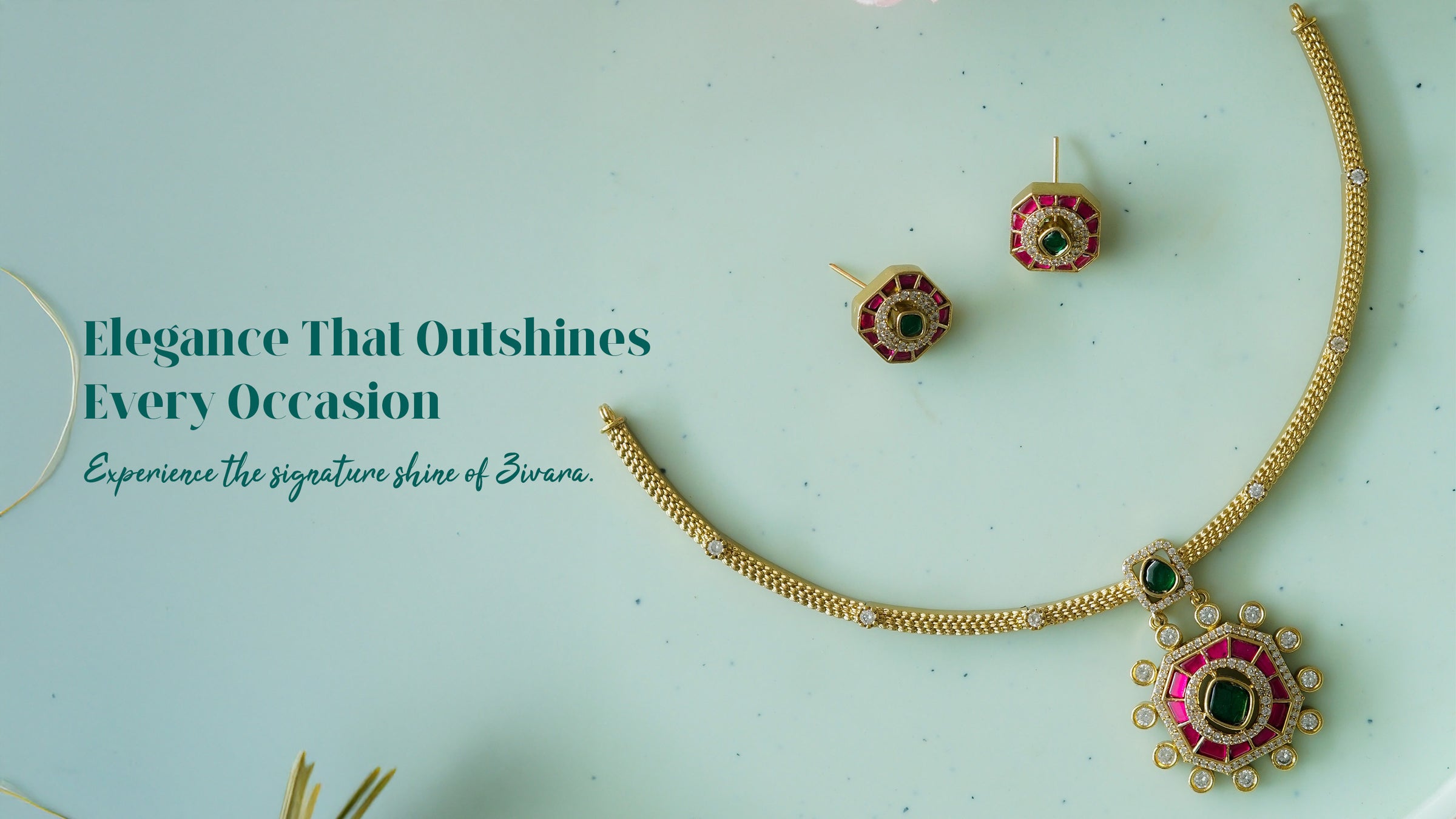 RUBY GREEN SIMPLE HASLI -PREMIUM SUBTLE GOLD FINISH stylish and minimal elegant neckwear with earrings- Zivara Fashion