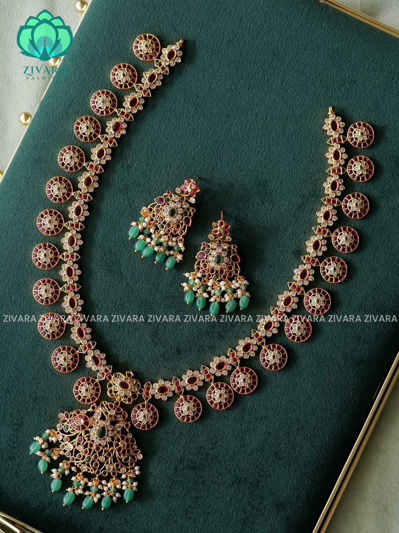 REAL KEMP GUTTAPUSALU - Traditional PREMIUM MATTE polish MIDCHEST haaram/neckwear with earrings- Zivara Fashion