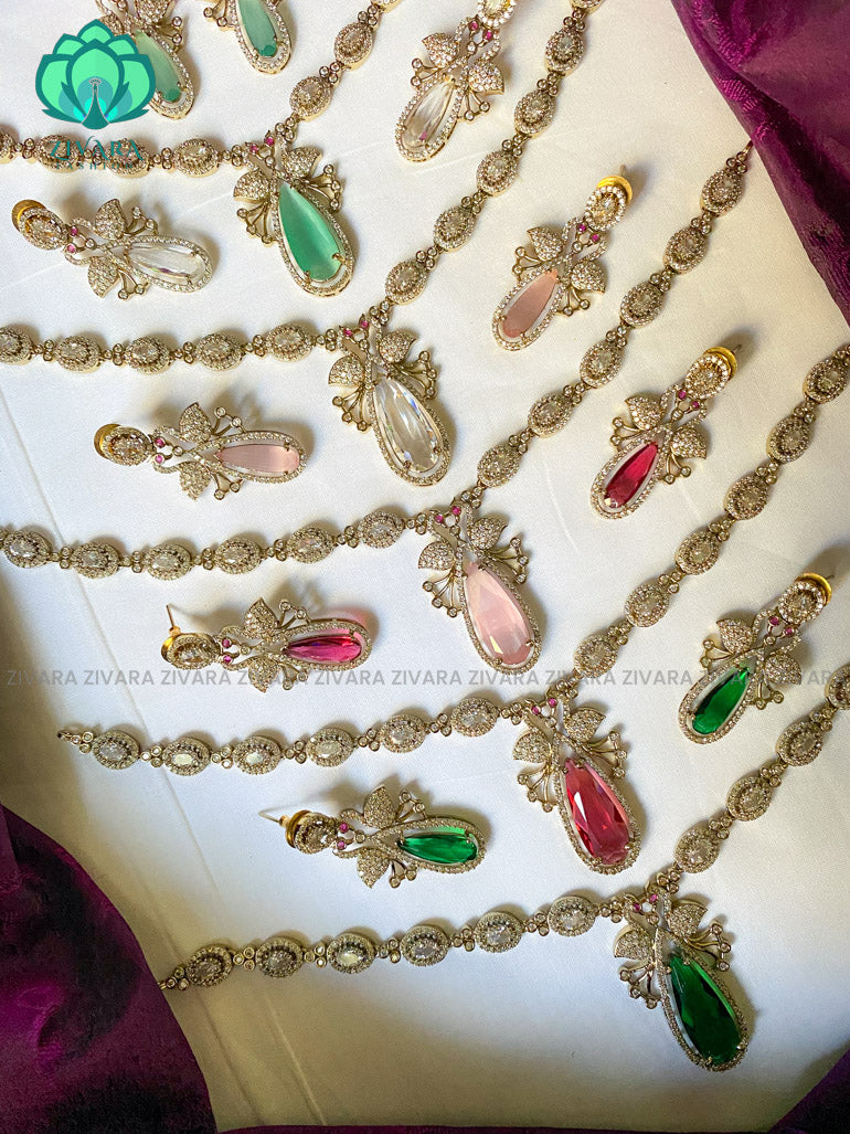 Victoria finish colourful pendant elegant necklace with earrings CZ matte Finish- Zivara Fashion