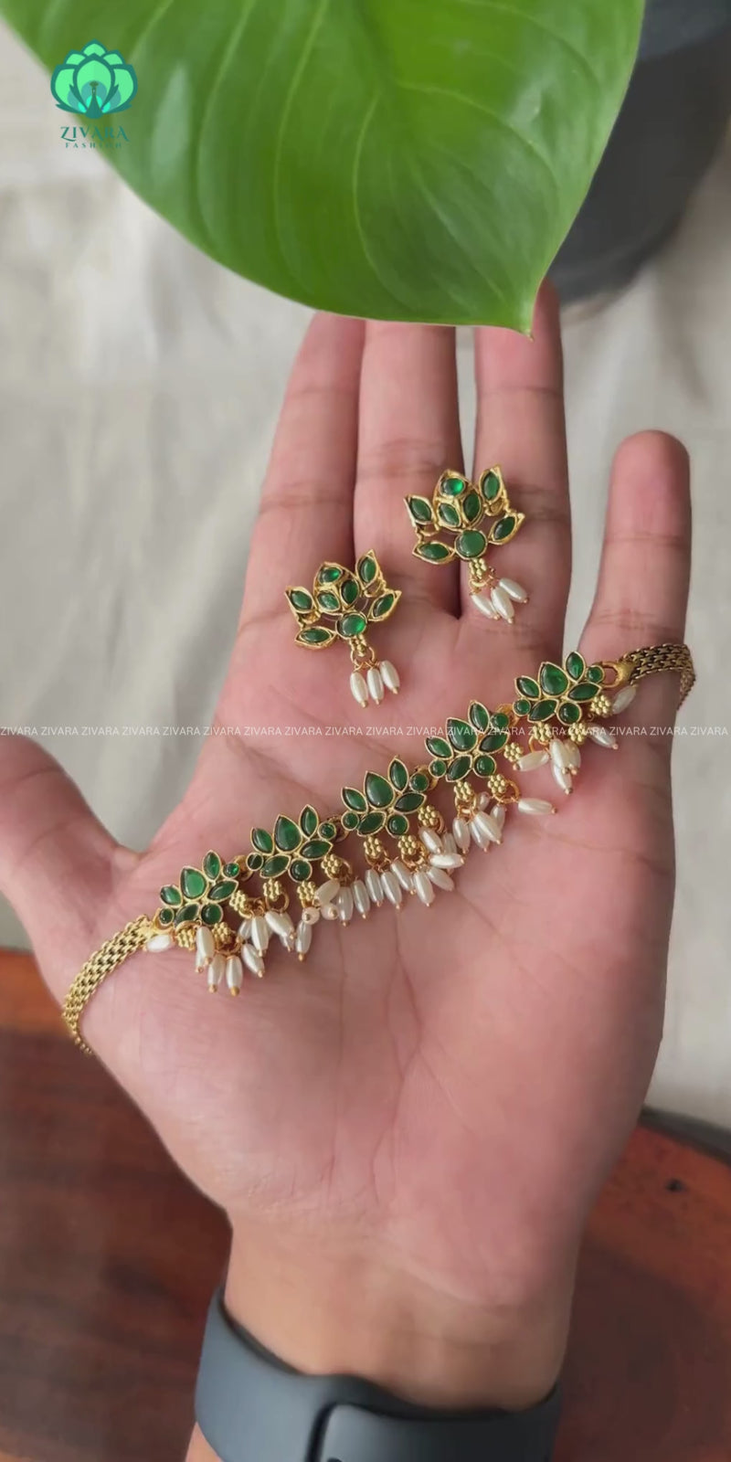 GREEN Flexible chain LEAF pendant -Traditional south indian premium neckwear with earrings- Zivara Fashion- latest jewellery design.